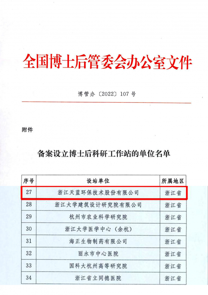 浙江天藍(lán)環(huán)保技術(shù)股份有限公司獲批國家級博士后工作站,標(biāo)志著天藍(lán)環(huán)保在人才隊(duì)伍、技術(shù)創(chuàng)新和科研平臺建設(shè)上的重大突破。