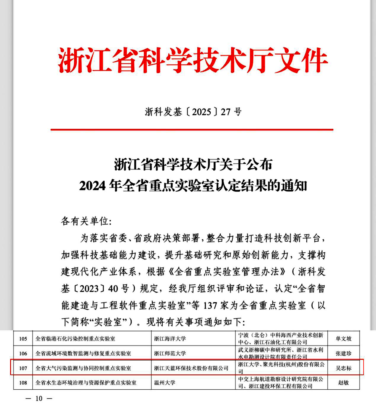 2025年6月4日,浙江省科技廳發(fā)布《浙江省科學(xué)技術(shù)廳關(guān)于公布2024 年全省重點(diǎn)實(shí)驗(yàn)室認(rèn)定結(jié)果的通知(浙科發(fā)基〔2025〕27號)》,由浙江天藍(lán)環(huán)保技術(shù)股份有限公司牽頭,浙江大學(xué)和聚光科技(杭州)股份有限公司共建的“全省大氣污染監(jiān)測與協(xié)同控制重點(diǎn)實(shí)驗(yàn)室”獲批組建,成為全省環(huán)境領(lǐng)域唯一以企業(yè)牽頭建設(shè)的省級重點(diǎn)實(shí)驗(yàn)室